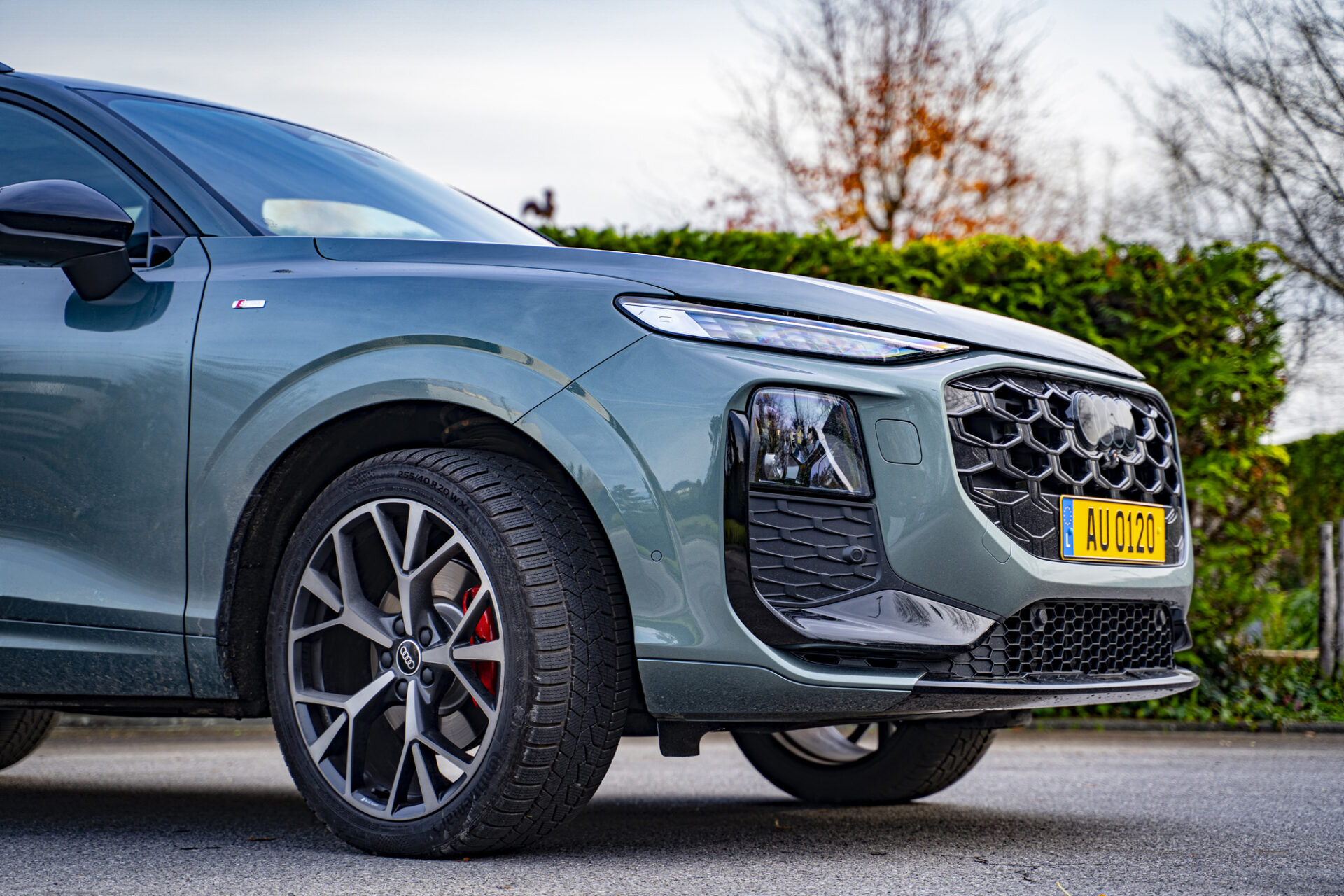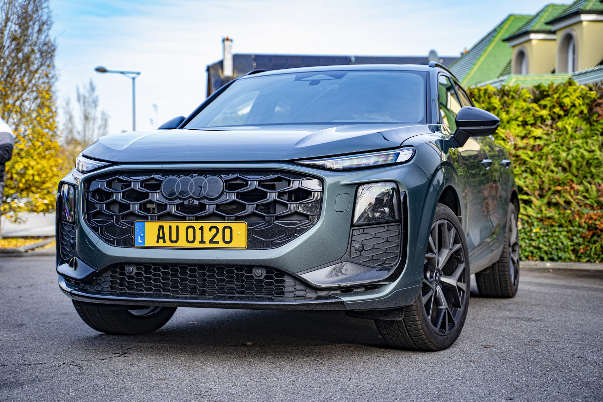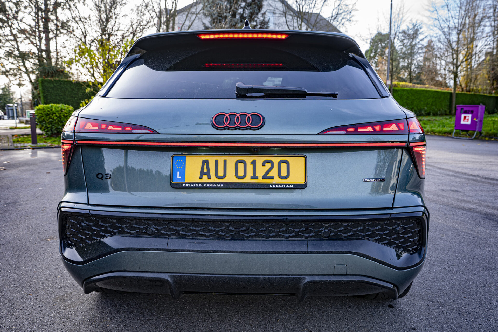 Der neue Q3 präsentiert sich mit einer markanten und dynamisch wirkenden Silhouette. Das Auto ist gut proportioniert und liegt mit 4,50 Metern Länge im Kompaktsegment in der Mitte. Die große Neuheit ist der achteckige Singleframe-Kühlergrill, der verbreitert wurde. Seitlich davon befinden sich Matrix-LED-Scheinwerfer mit Mikro-LED-Technologie, die eine Lichtsignatur bieten, die sich individuell an die Stimmung des Fahrers anpassen lässt. Auch am Heck wurde die Lichtsignatur überarbeitet. Sie verfügt nun über einen durchgehenden LED-Streifen, der sich über die gesamte Breite des Fahrzeugs erstreckt, sowie Rückleuchten im Origami-Design. Das kleine Extra: das optional erhätliche beleuchtete Audi-Logo. Die Felgen, die bis zu 20 Zoll groß sind, verleihen dem Fahrzeug einen Hauch von Raffinesse. Das Gesamtbild strahlt Modernität aus, mit einer sorgfältigen Verarbeitung und Details, die für das Premiumsegment typisch sind.