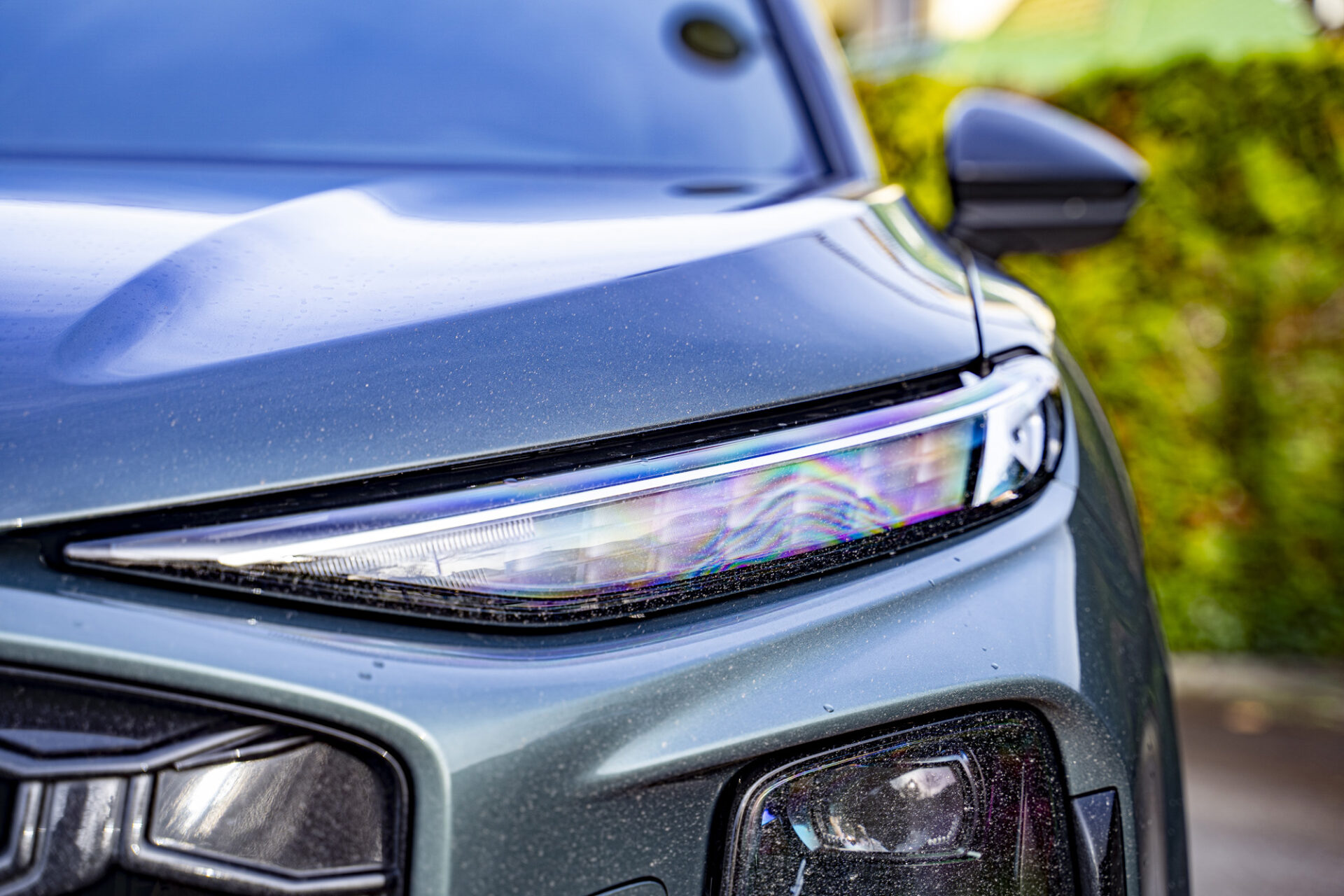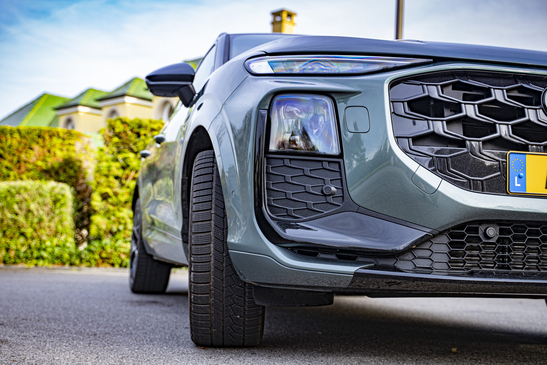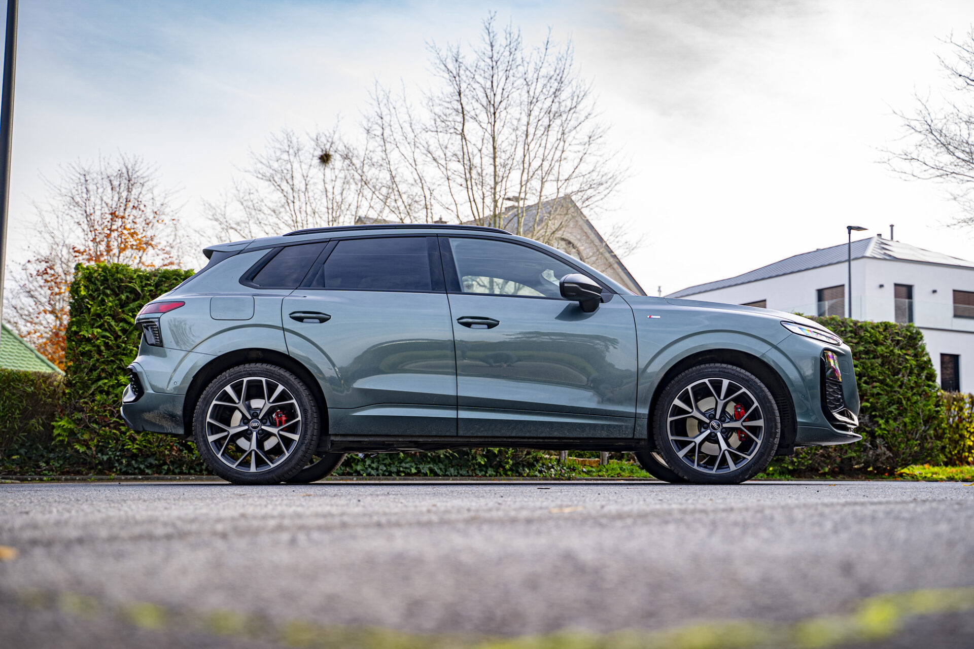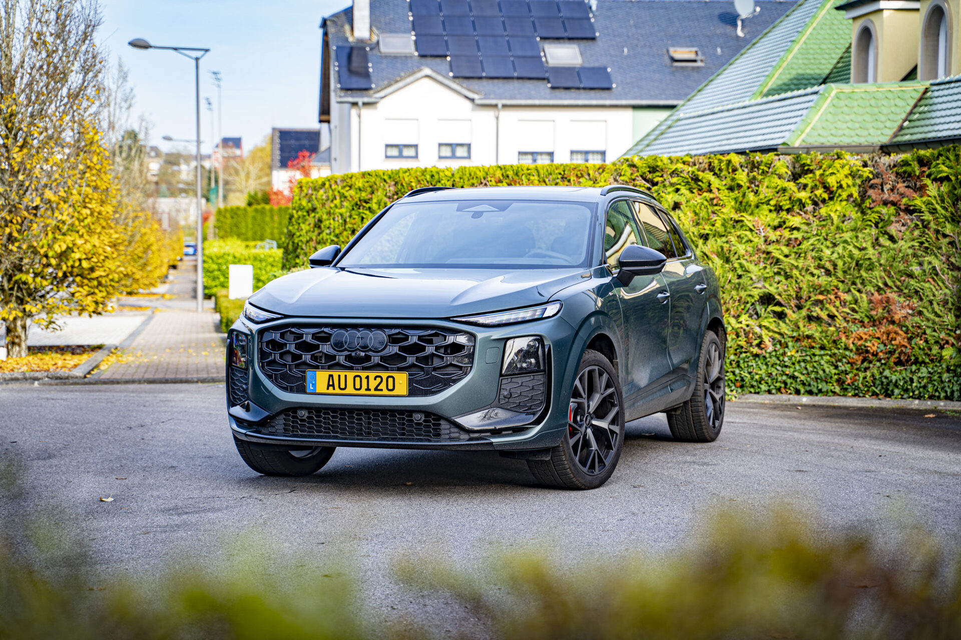Der neue Q3 präsentiert sich mit einer markanten und dynamisch wirkenden Silhouette. Das Auto ist gut proportioniert und liegt mit 4,50 Metern Länge im Kompaktsegment in der Mitte. Die große Neuheit ist der achteckige Singleframe-Kühlergrill, der verbreitert wurde. Seitlich davon befinden sich Matrix-LED-Scheinwerfer mit Mikro-LED-Technologie, die eine Lichtsignatur bieten, die sich individuell an die Stimmung des Fahrers anpassen lässt. Auch am Heck wurde die Lichtsignatur überarbeitet. Sie verfügt nun über einen durchgehenden LED-Streifen, der sich über die gesamte Breite des Fahrzeugs erstreckt, sowie Rückleuchten im Origami-Design. Das kleine Extra: das optional erhätliche beleuchtete Audi-Logo. Die Felgen, die bis zu 20 Zoll groß sind, verleihen dem Fahrzeug einen Hauch von Raffinesse. Das Gesamtbild strahlt Modernität aus, mit einer sorgfältigen Verarbeitung und Details, die für das Premiumsegment typisch sind.