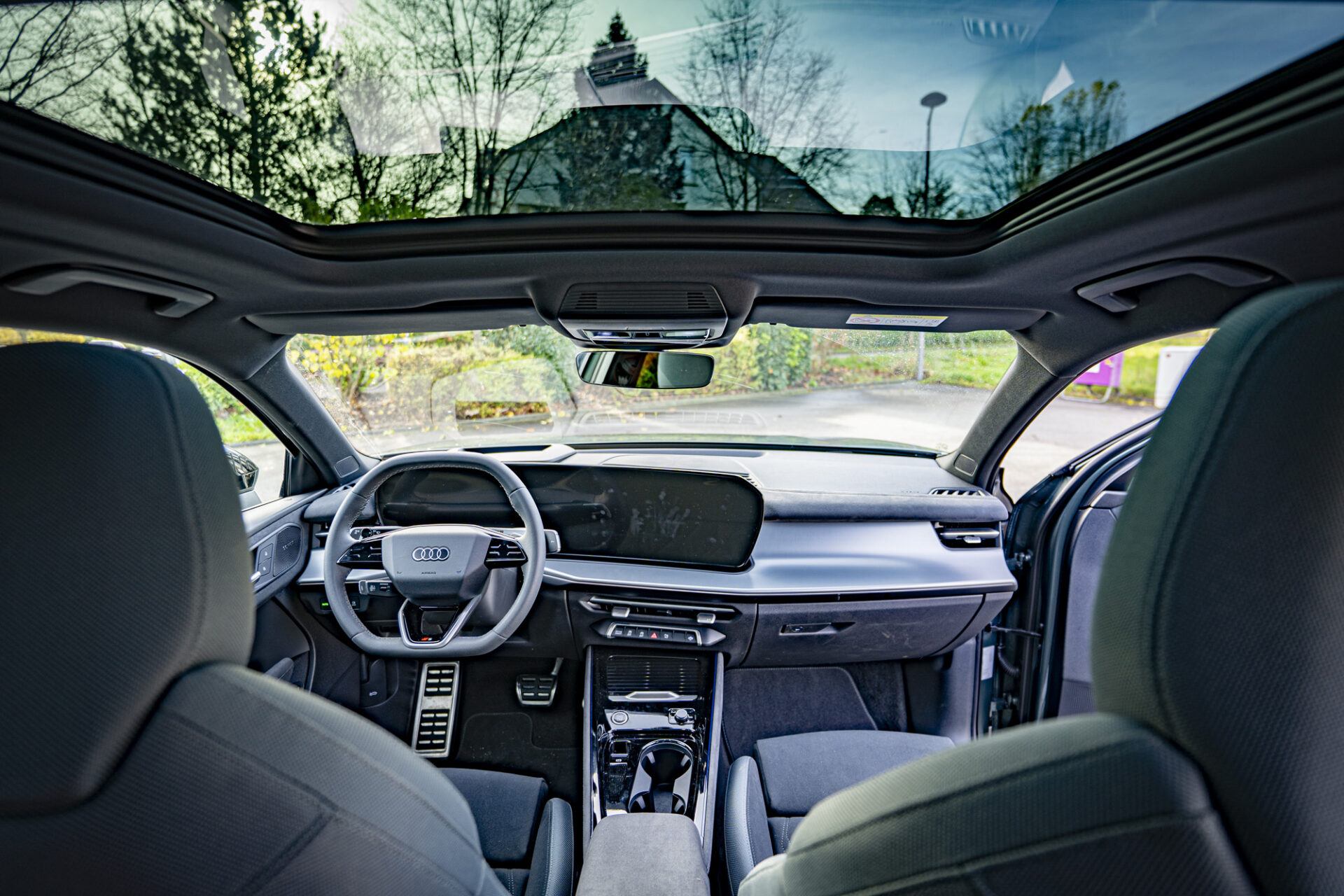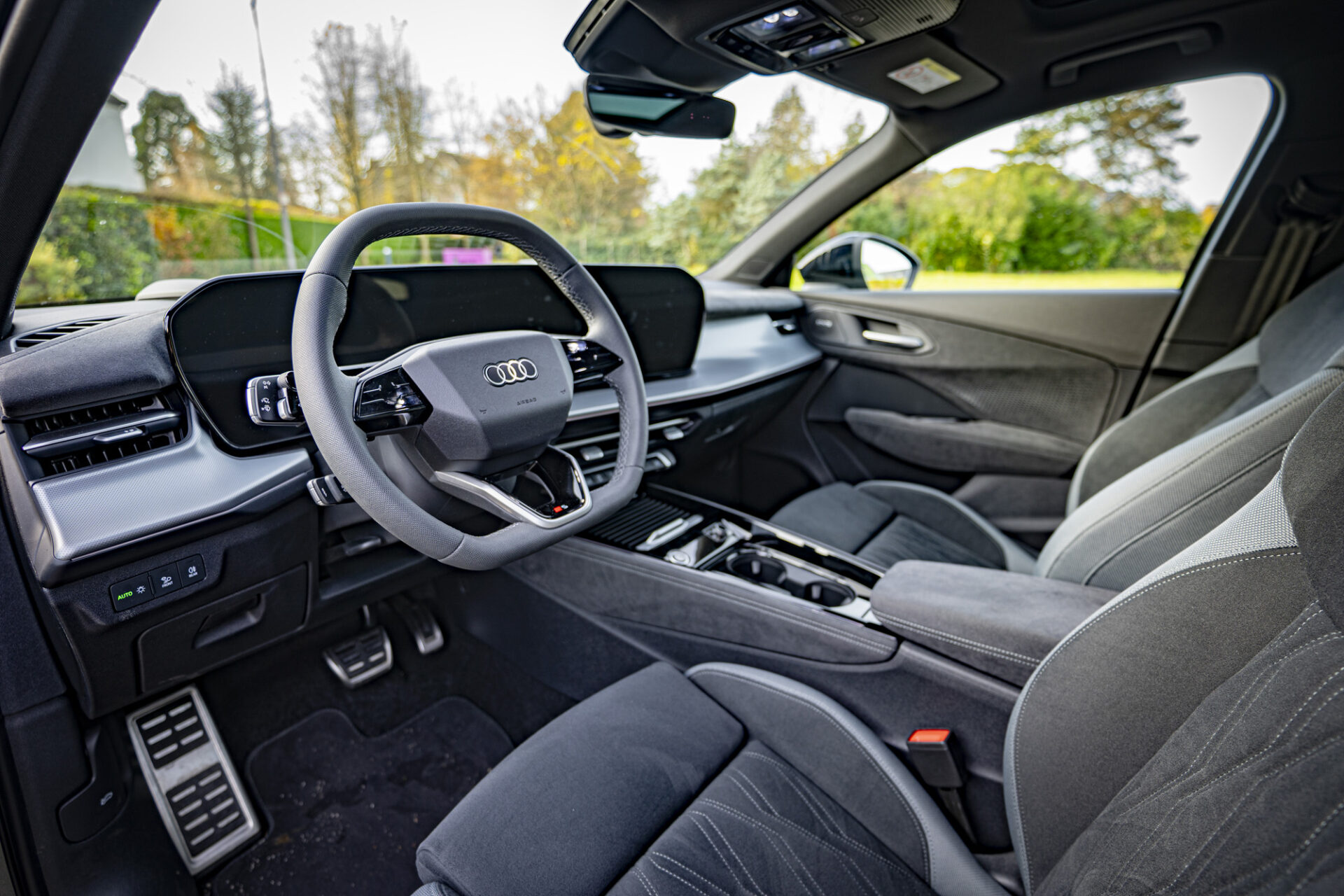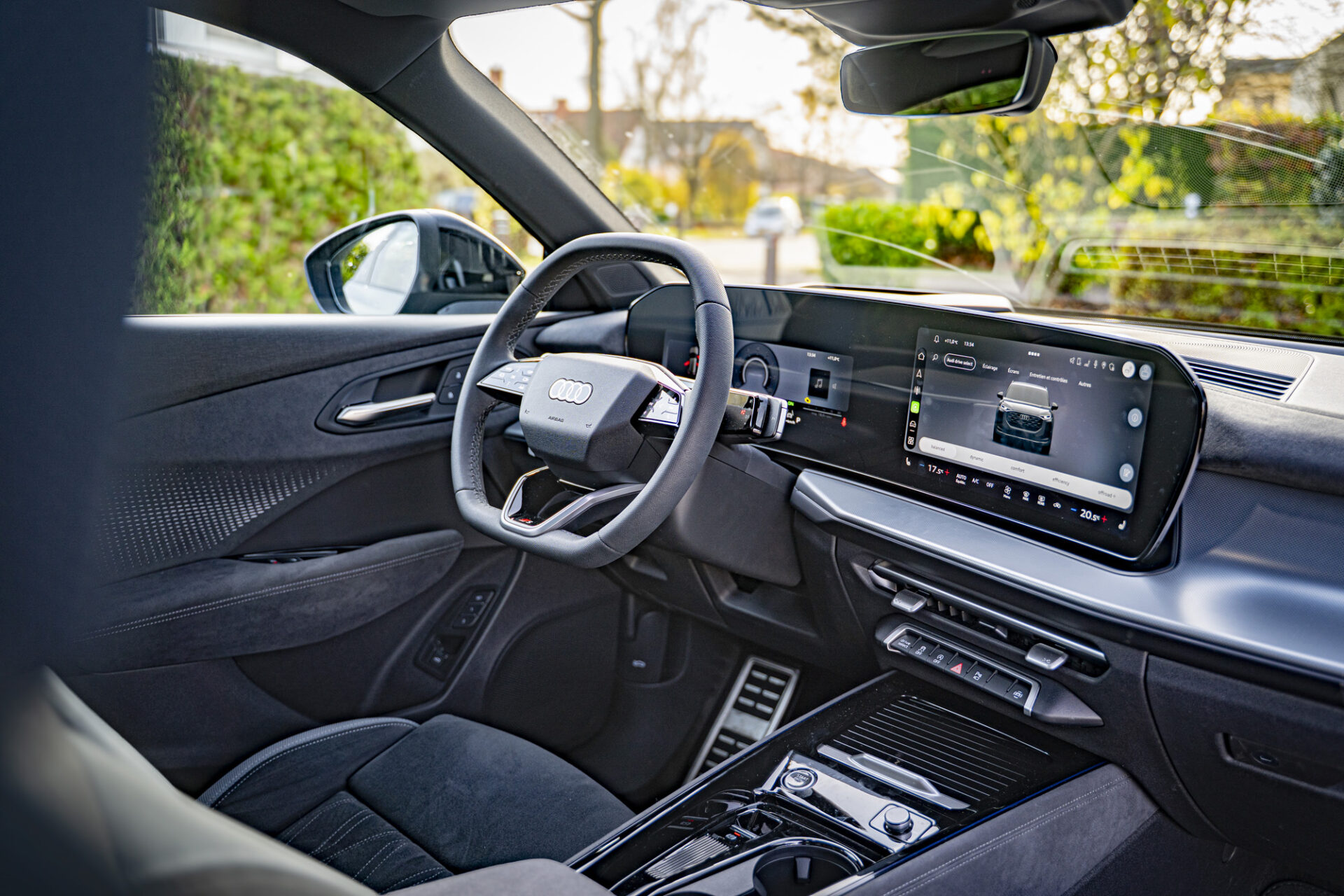 Der Innenraum strahlt eine von Technologie geprägte und puristische Atmosphäre aus. Das digitale Cockpit besteht aus dem 11,9 Zoll großen Audi Virtual Cockpit Plus und einem 14,5-Zoll-MMI-Touchscreen, der leicht zum Fahrer hin gewölbt ist. Die wichtigsten Bedienelemente wie Gangwahlhebel, Blinker und Beleuchtung sind um das Lenkrad herum angeordnet. Die individuell einstellbare Ambientebeleuchtung mit 30 Farben schafft eine warme Atmosphäre. Die bequemen und gut gestalteten Sitze bieten auch auf langen Fahrten guten Halt.