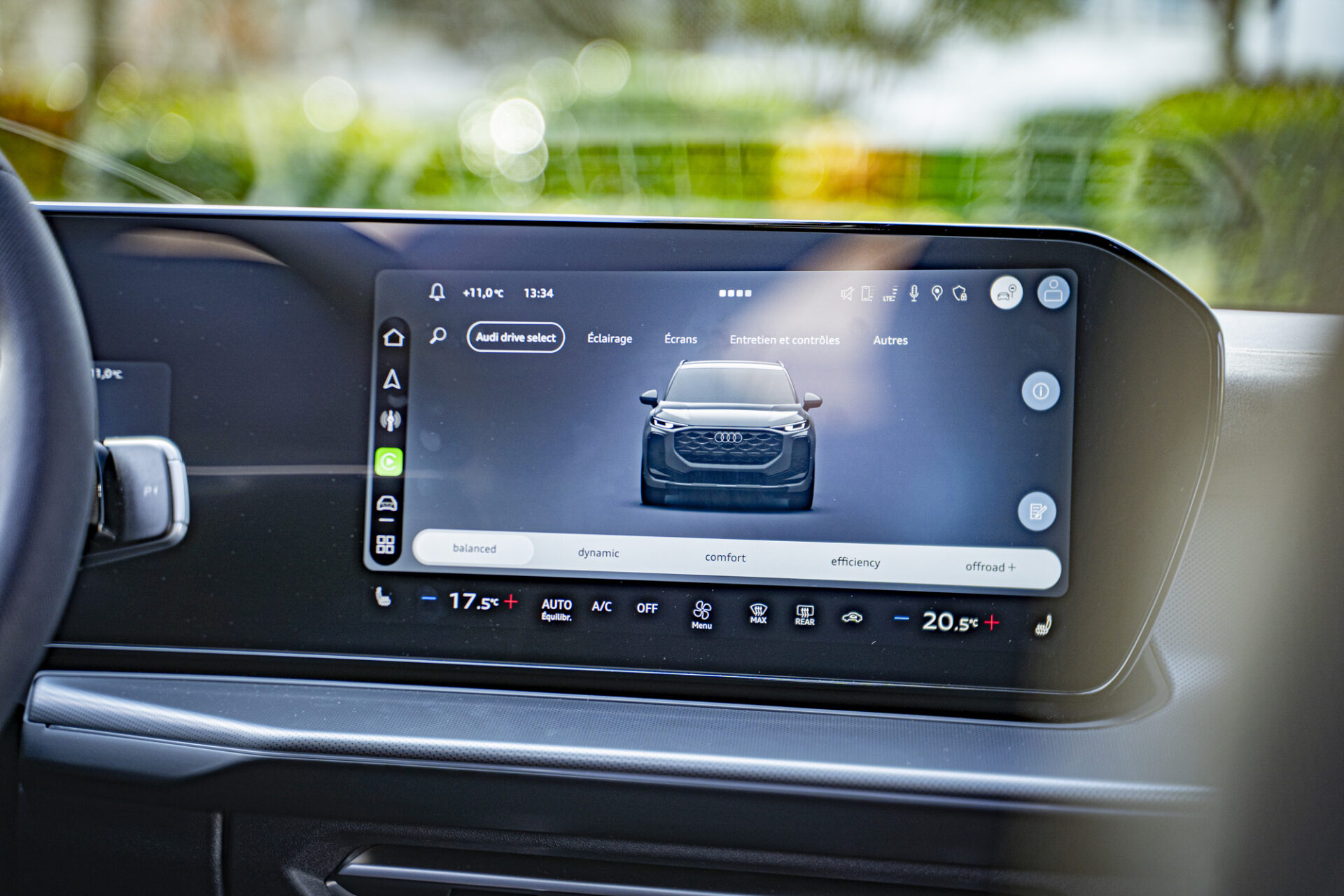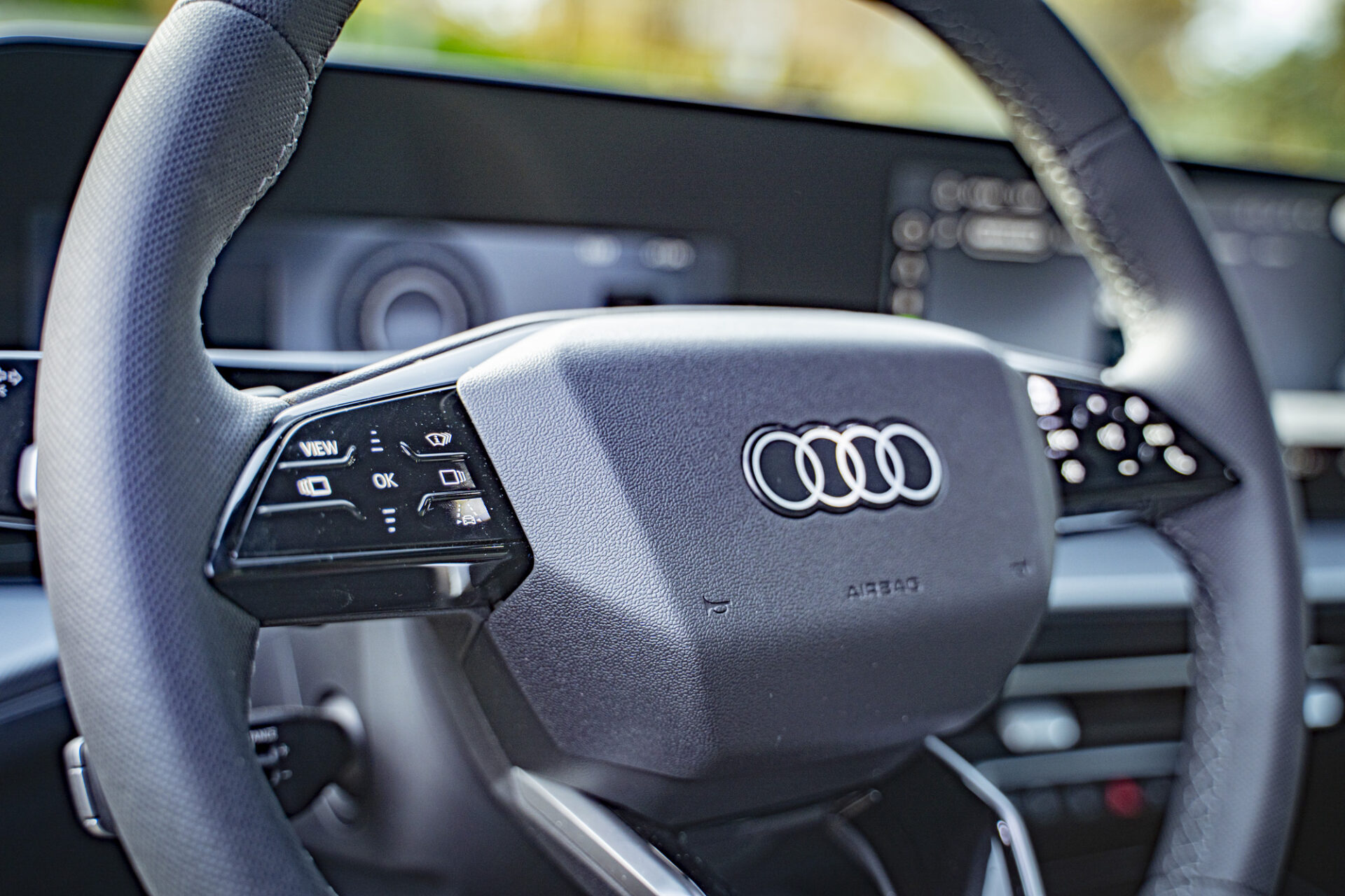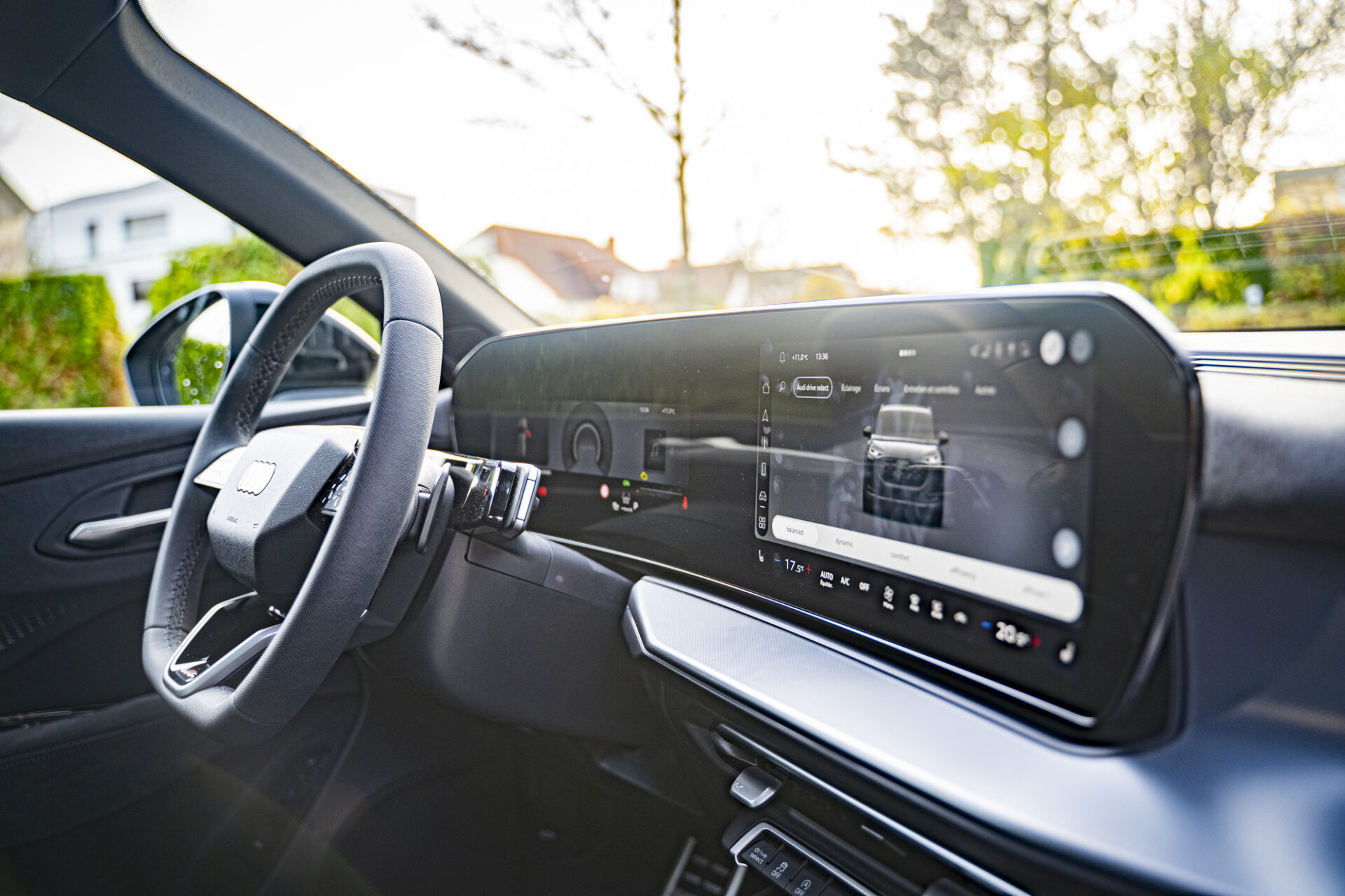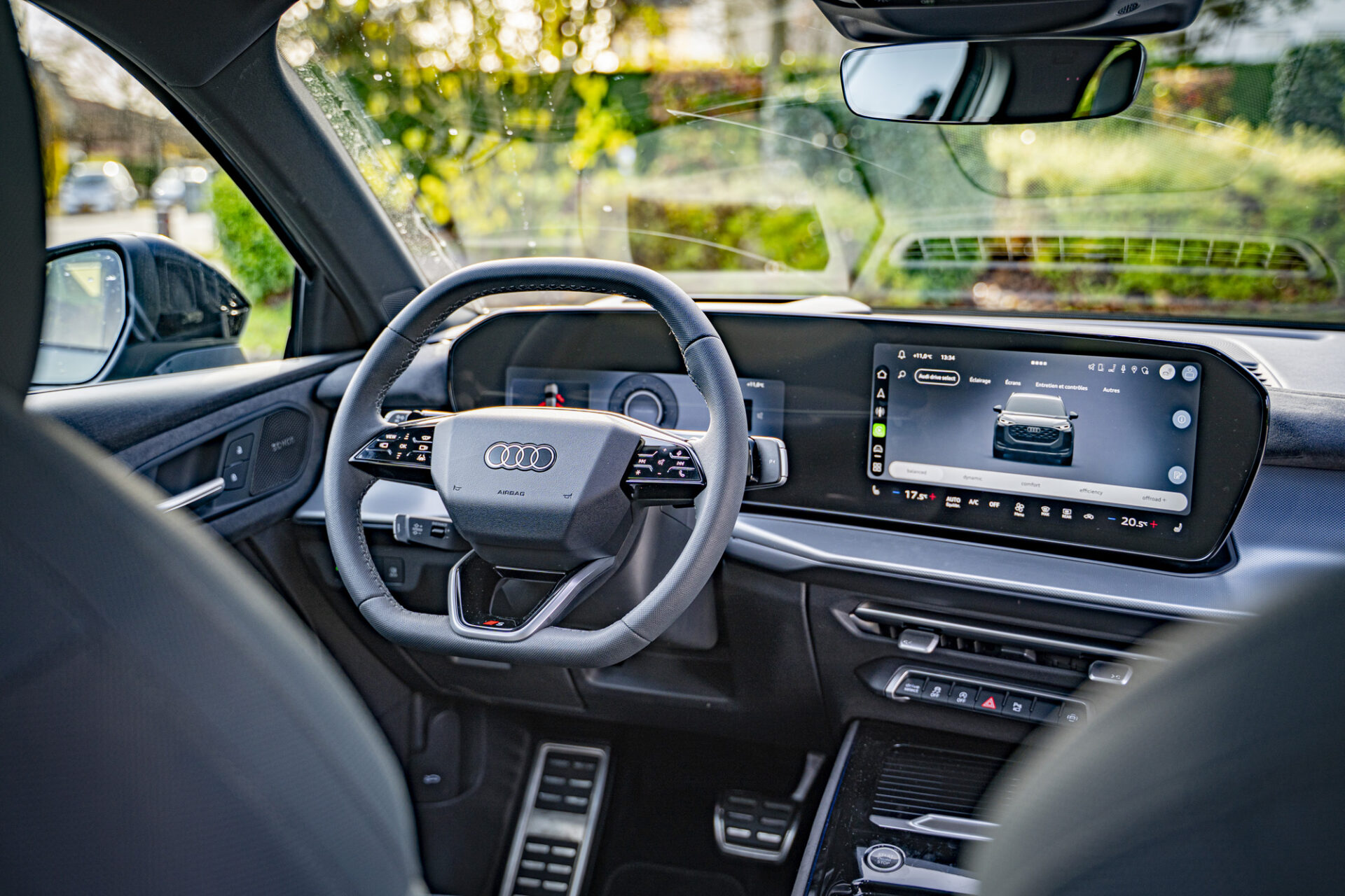 Der Innenraum strahlt eine von Technologie geprägte und puristische Atmosphäre aus. Das digitale Cockpit besteht aus dem 11,9 Zoll großen Audi Virtual Cockpit Plus und einem 14,5-Zoll-MMI-Touchscreen, der leicht zum Fahrer hin gewölbt ist. Die wichtigsten Bedienelemente wie Gangwahlhebel, Blinker und Beleuchtung sind um das Lenkrad herum angeordnet. Die individuell einstellbare Ambientebeleuchtung mit 30 Farben schafft eine warme Atmosphäre. Die bequemen und gut gestalteten Sitze bieten auch auf langen Fahrten guten Halt.