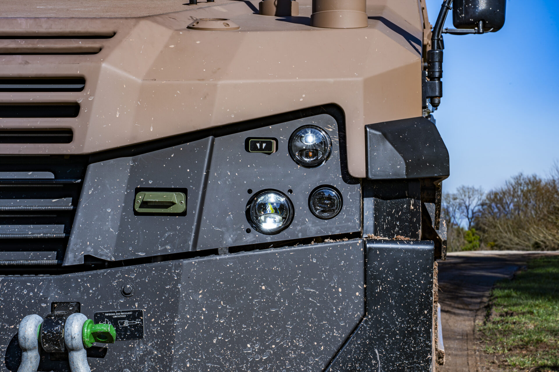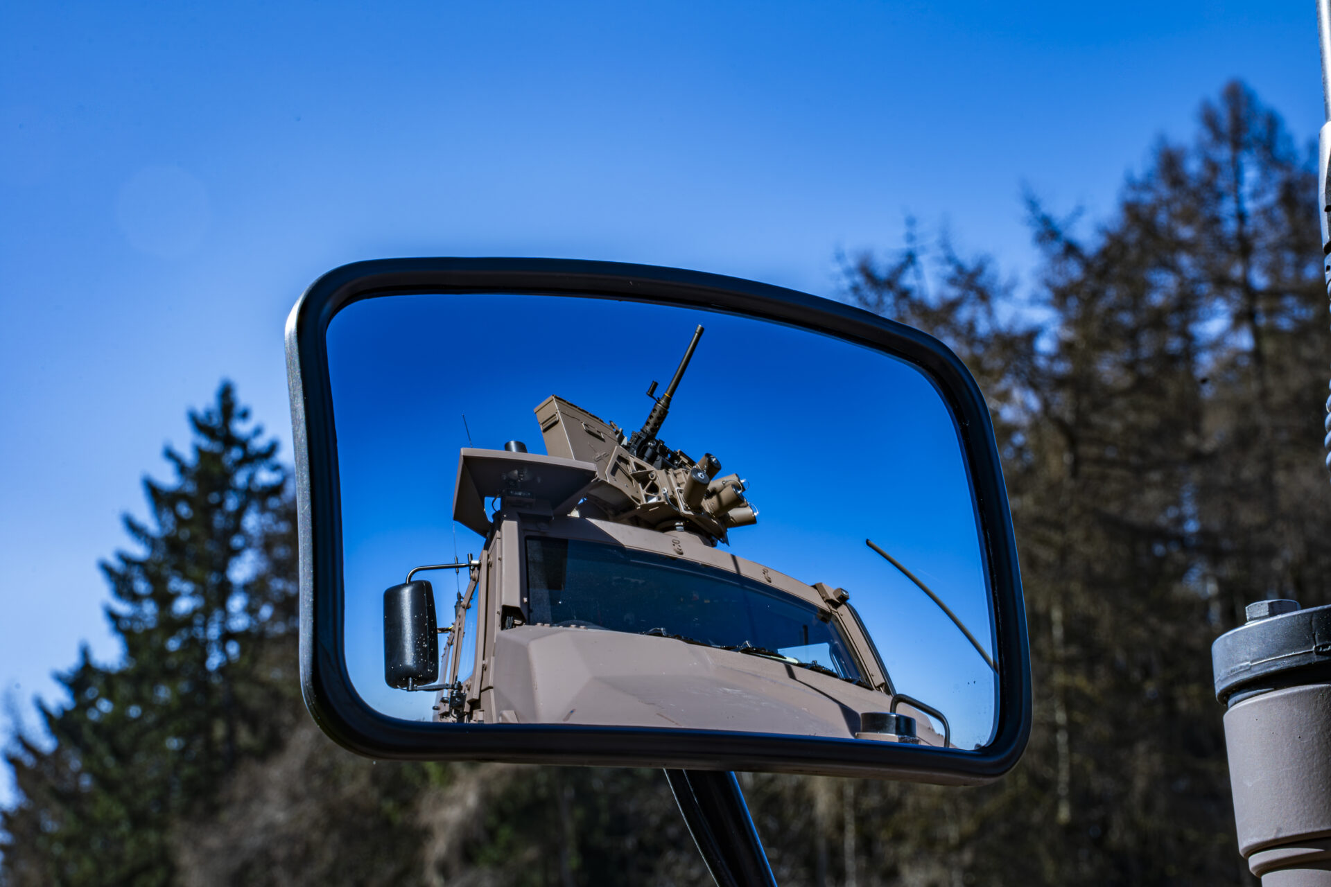 Unter den militärischen Sonderausstattungen verdient das NBC-Schutzsystem (nuklear, biologisch, chemisch) besondere Erwähnung. Überdruck in der Kabine verhindert, dass Schadstoffe von außen eindringen. So muss die Besatzung keine Schutzmasken tragen. Der Druckaufbau ist beim Aktivieren des Ventils hörbar. Eine Sprechanlage ermöglicht zudem die Kommunikation mit der Außenwelt, ohne die Türen öffnen zu müssen – eine wertvolle Vorsichtsmaßnahme in Risikogebieten.