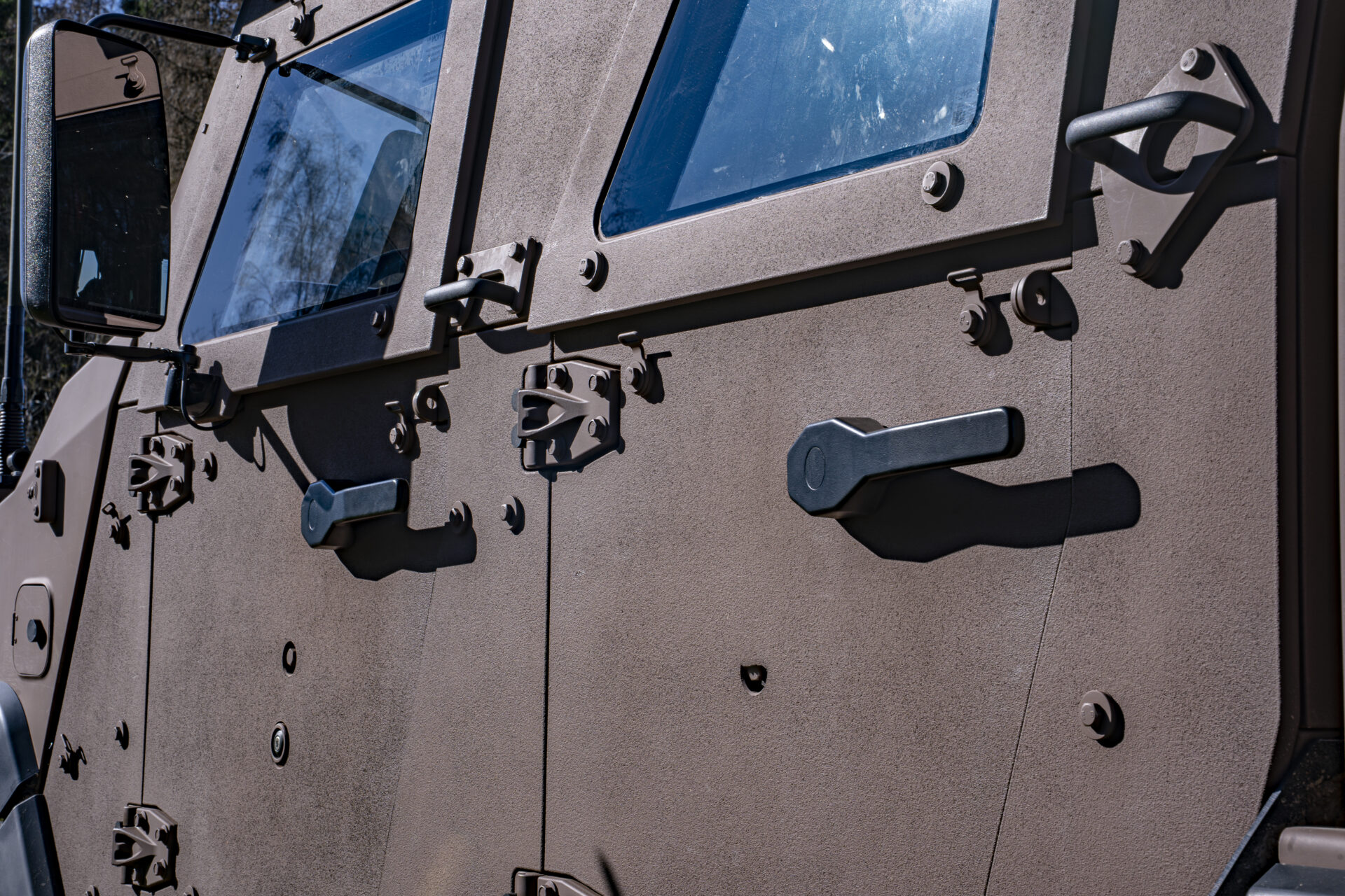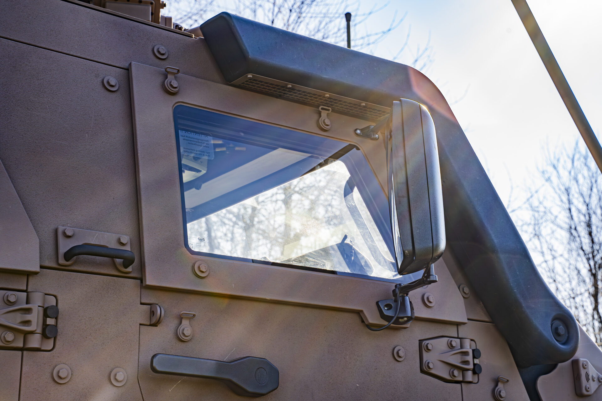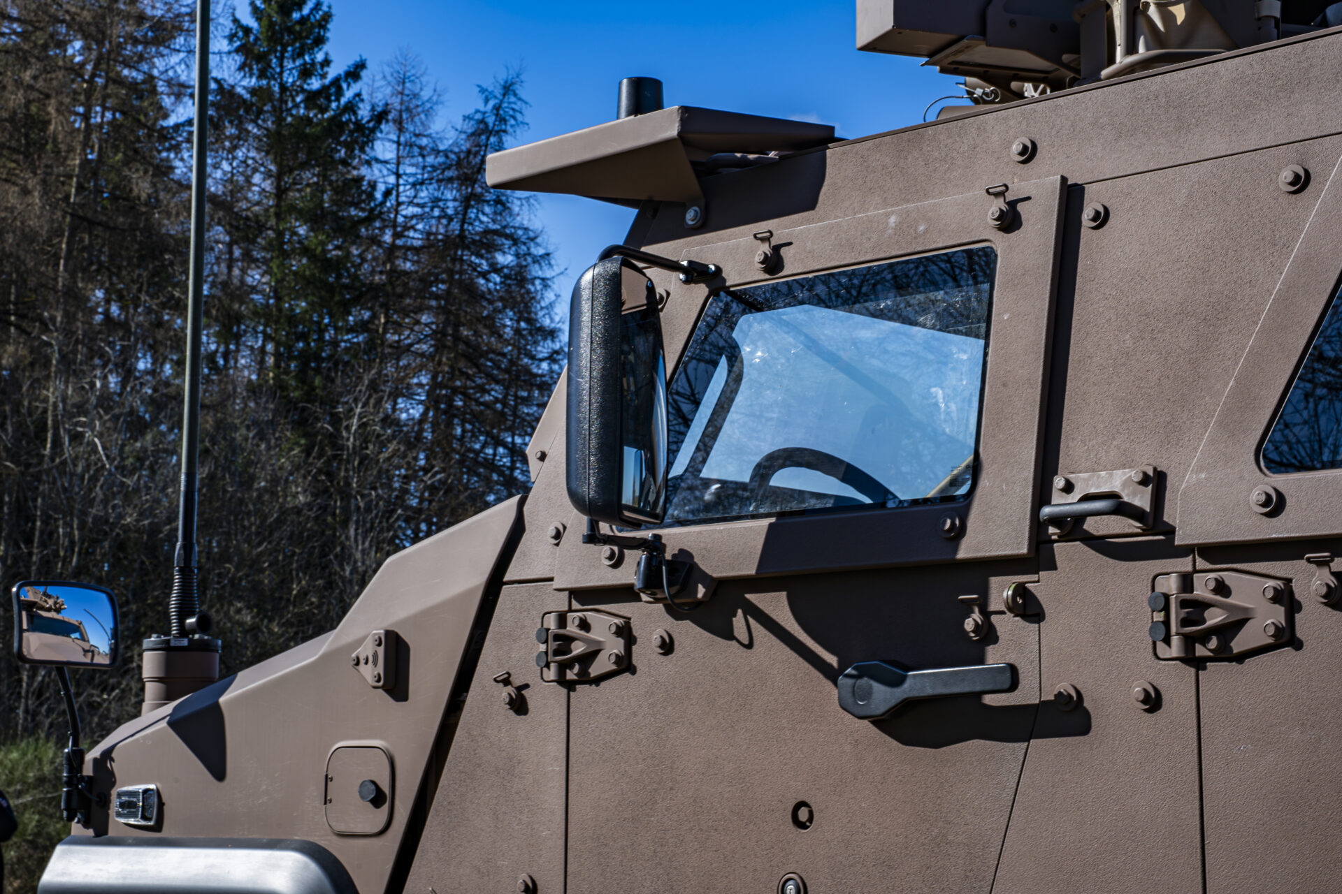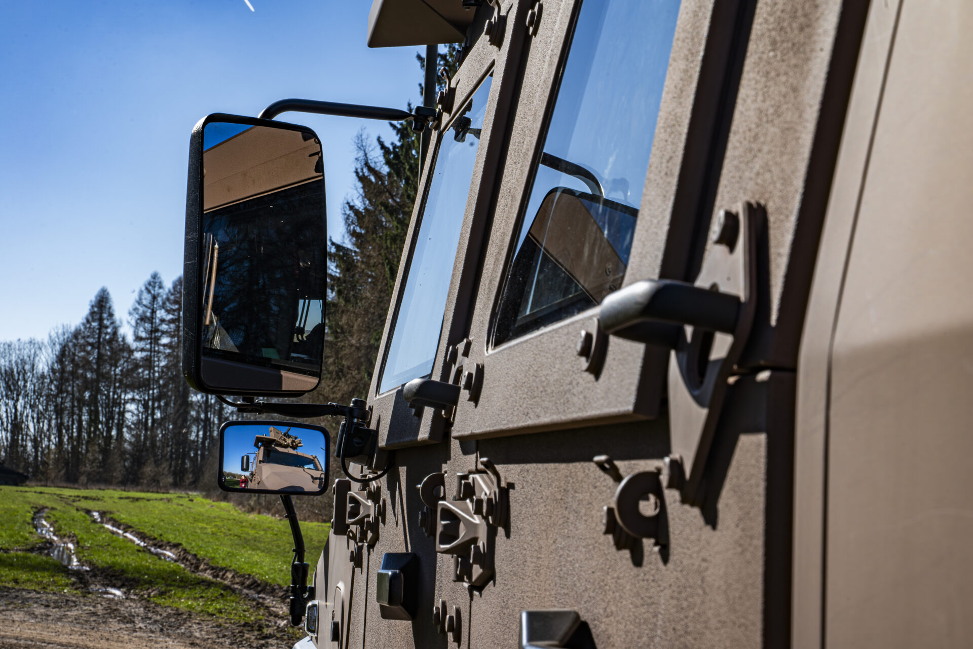 Auch das Türschließsystem ist darauf ausgelegt, die Passagiere zu schützen: Statt eines herkömmlichen Schlosses werden die Türen durch ein Bolzensystem gehalten, das der Druckwelle einer Minenexplosion standhält. Ein Dämpfer verhindert, dass die Tür in Schräglage unter ihrem Eigengewicht zufällt. „Wenn man auf eine Mine fährt, kann die Energie der Druckwelle eine normale Tür herausschleudern. Mit diesem System sind unsere Einsatzkräfte besser geschützt“, erläutert Adjudant-Major Lex. Auch die V-Form der Bodenwanne ist kein Zufall: Sie leitet die Druckwelle einer Explosion seitlich ab, anstatt sie frontal aufzunehmen, was für einen deutlich besseren Schutz der Besatzung sorgt.