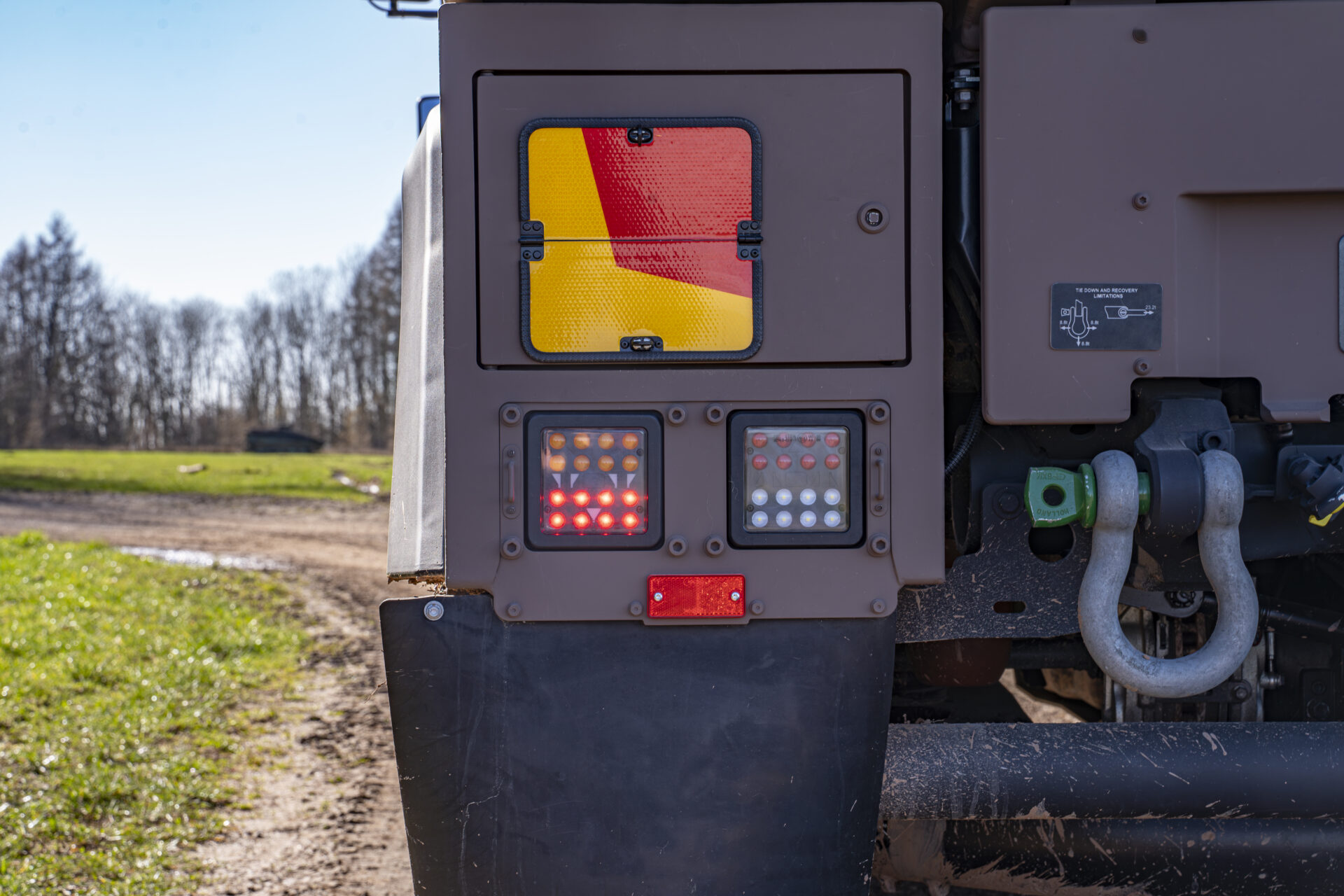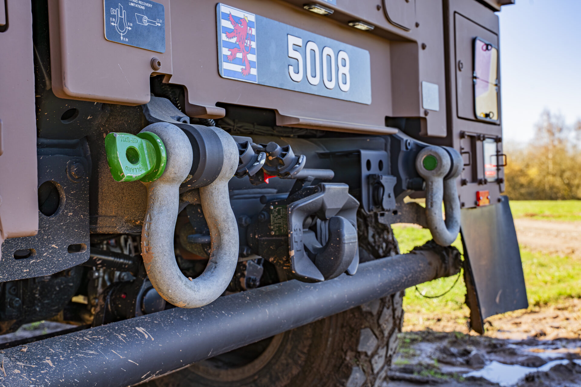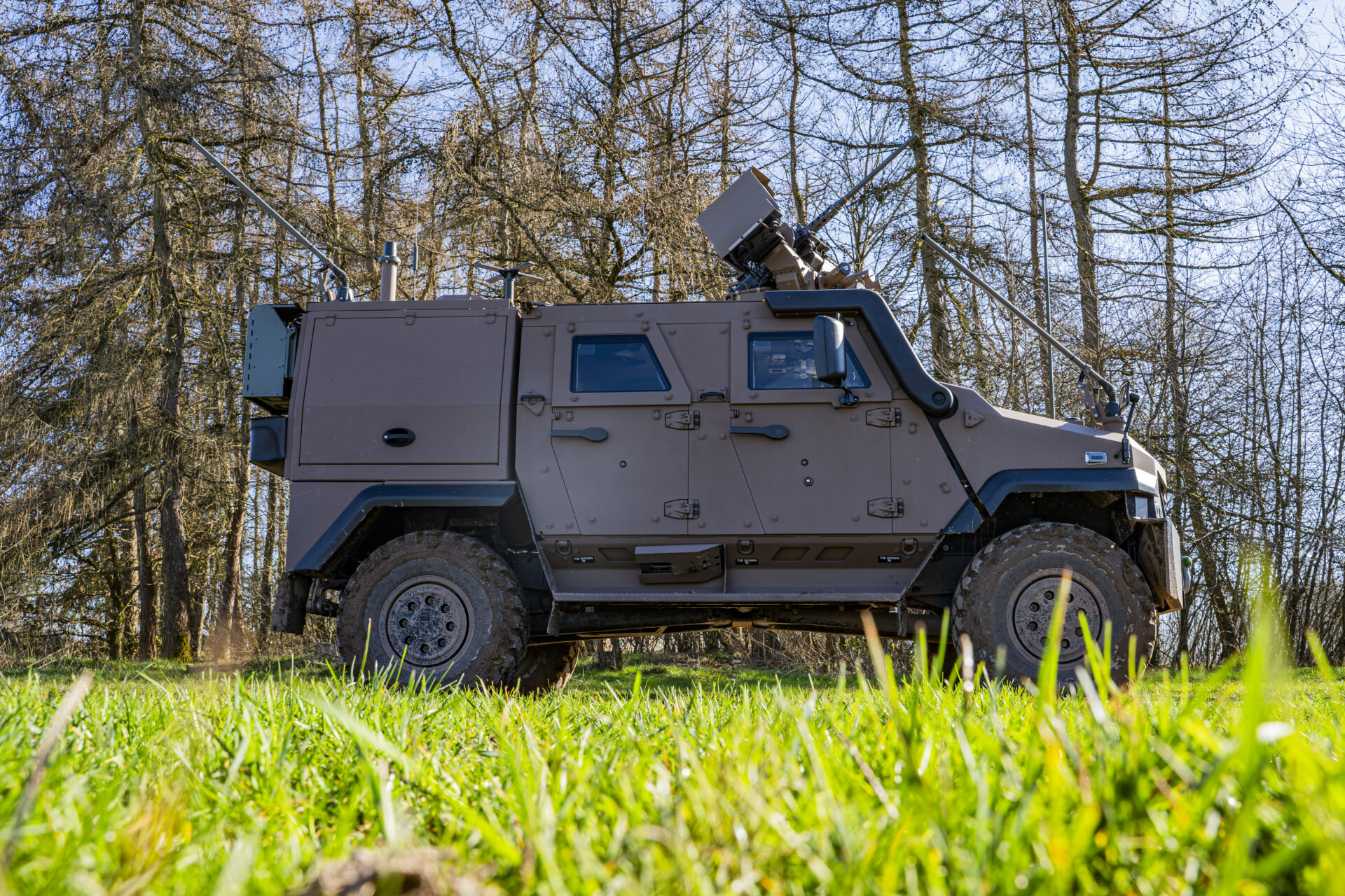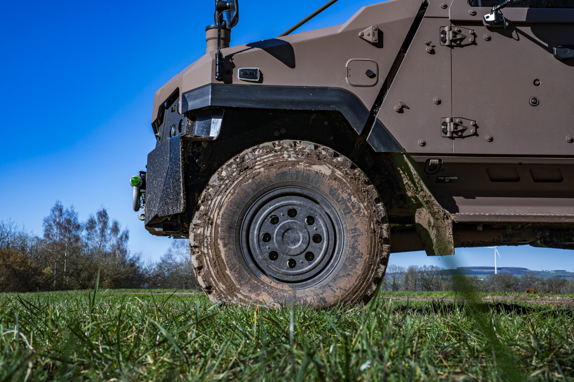 Auch das Türschließsystem ist darauf ausgelegt, die Passagiere zu schützen: Statt eines herkömmlichen Schlosses werden die Türen durch ein Bolzensystem gehalten, das der Druckwelle einer Minenexplosion standhält. Ein Dämpfer verhindert, dass die Tür in Schräglage unter ihrem Eigengewicht zufällt. „Wenn man auf eine Mine fährt, kann die Energie der Druckwelle eine normale Tür herausschleudern. Mit diesem System sind unsere Einsatzkräfte besser geschützt“, erläutert Adjudant-Major Lex. Auch die V-Form der Bodenwanne ist kein Zufall: Sie leitet die Druckwelle einer Explosion seitlich ab, anstatt sie frontal aufzunehmen, was für einen deutlich besseren Schutz der Besatzung sorgt.