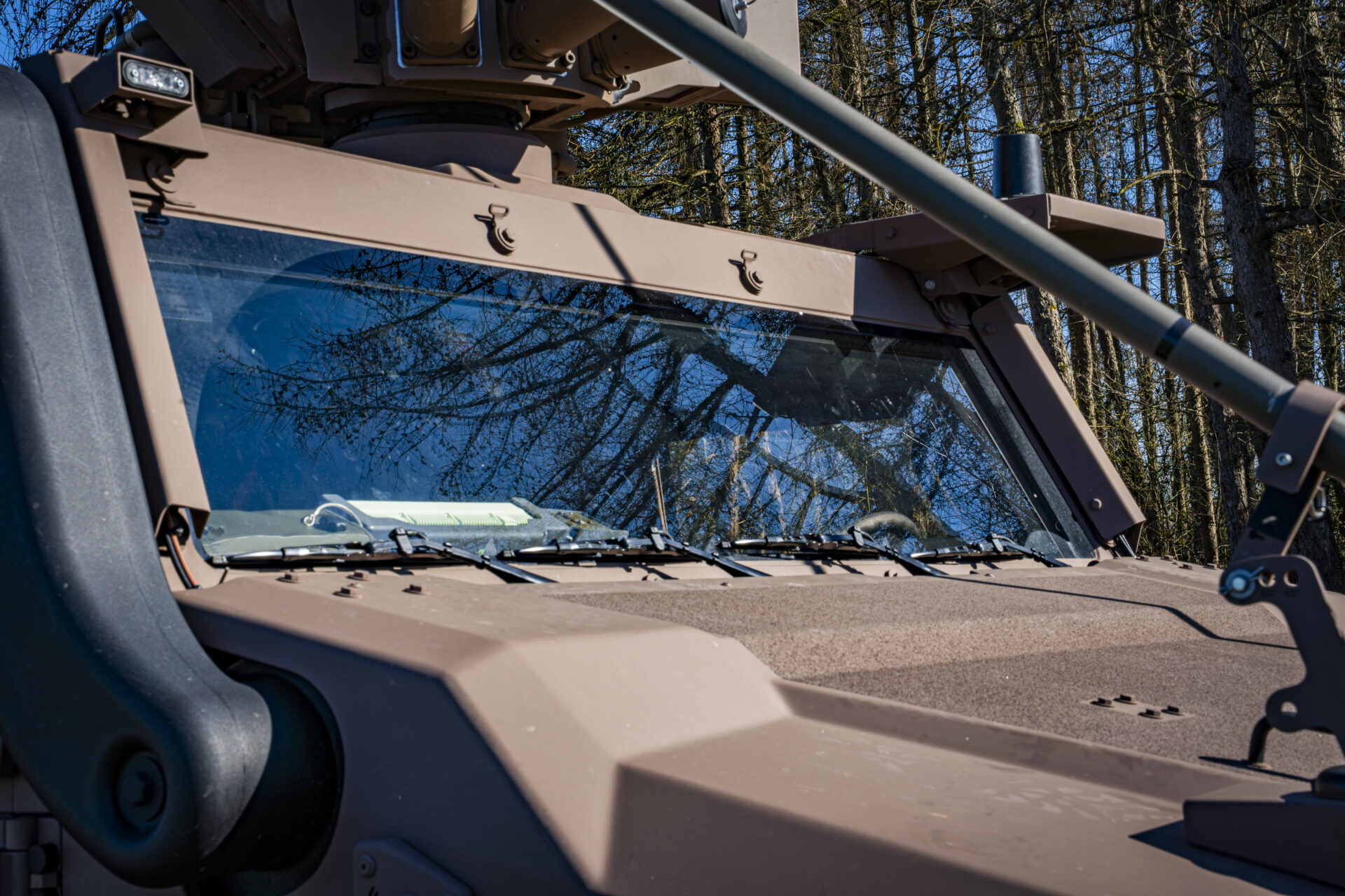 Die Kabine des CLRV ist vollständig gepanzert. Die Scheiben – darunter die Frontscheibe, deren Wert auf rund 10.000 Euro geschätzt wird – halten Handfeuerwaffen stand.