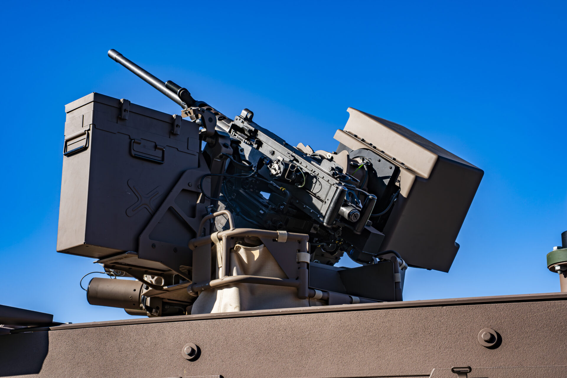 Der am Heck des Fahrzeugs montierte Störsender ist vollständig programmierbar. Er kann gezielt bestimmte Frequenzen neutralisieren – etwa die eines ferngesteuerten Geräts, eines Fernzünders oder eines anderen gegnerischen Systems –, ohne dabei die internen Kommunikationswege der Besatzung zu beeinträchtigen. „Man kann festlegen, dass Frequenz X gestört wird. Wenn man weiß, dass das ferngesteuerte Gerät auf Frequenz Z operiert, blockiert man sie und neutralisiert es ohne einen direkten Kampfakt“, erklärt Adjudant-Major Lex.